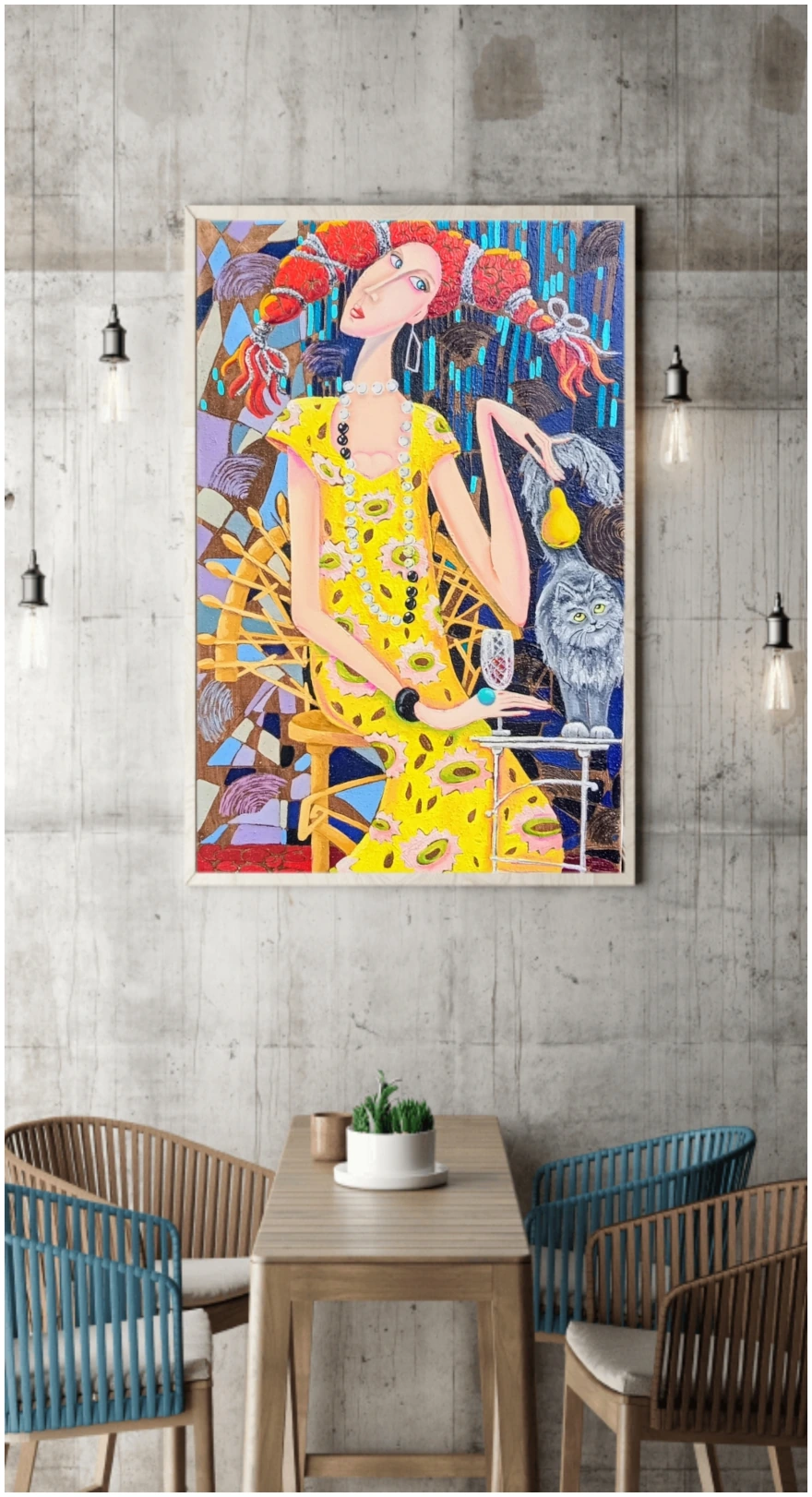 Աշխատանքի նկարագրությունը՝ Առաջարկվում է գունեղ և արտահայտիչ արվեստի գործ՝ ժամանակակից, դեկորատիվ ոճով։ Նկարում պատկերված է նրբագեղ կին կերպար՝ վառ գույներով, յուրահատուկ հագուստով և խորհրդանշական մանրամասներով (մարգարիտներ, կատու, գինի), որը ստեղծում է երազկոտ և հեքիաթային մթնոլորտ։