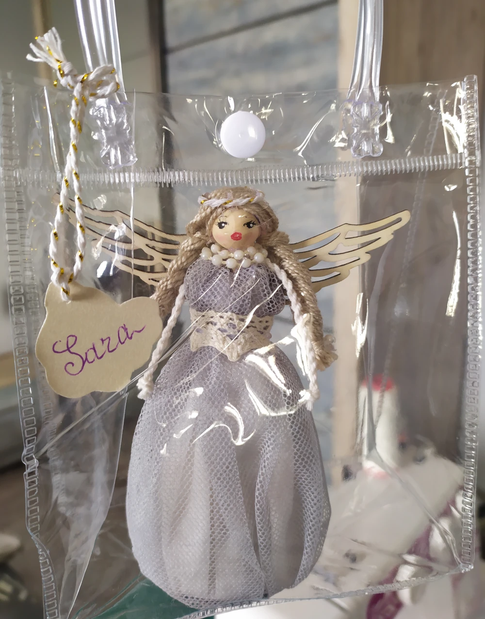 - Materials used: Fabric, tulle, yarn, beads, decorative lace, wooden wings, thread and sewing materials, glue, paint, plastic gift bag.