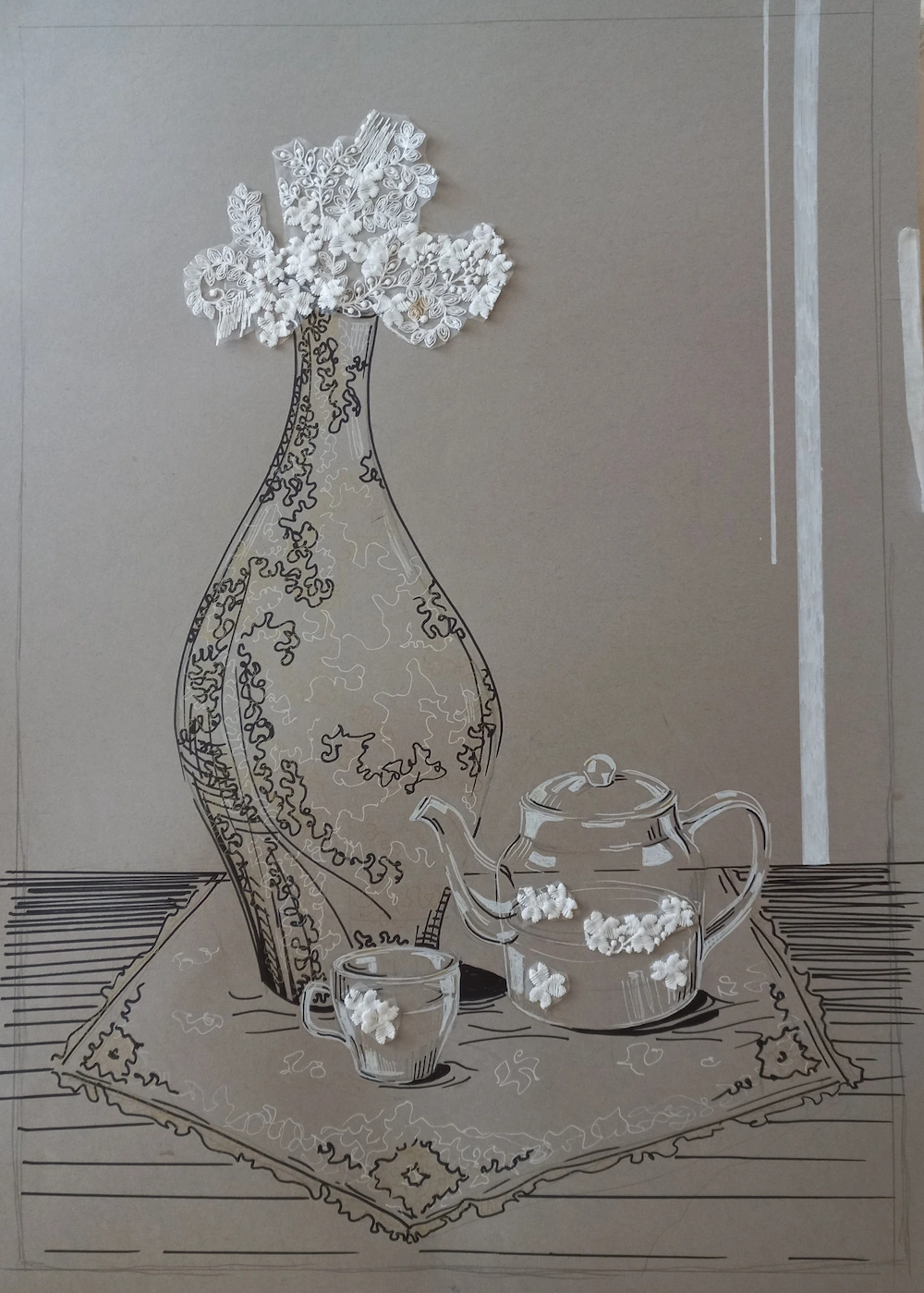 A kitchen scene. A bouquet of flowers in a vase and a teapot filled with tea made from those flowers. The flowers are made of fabric and have a 3D effect.
