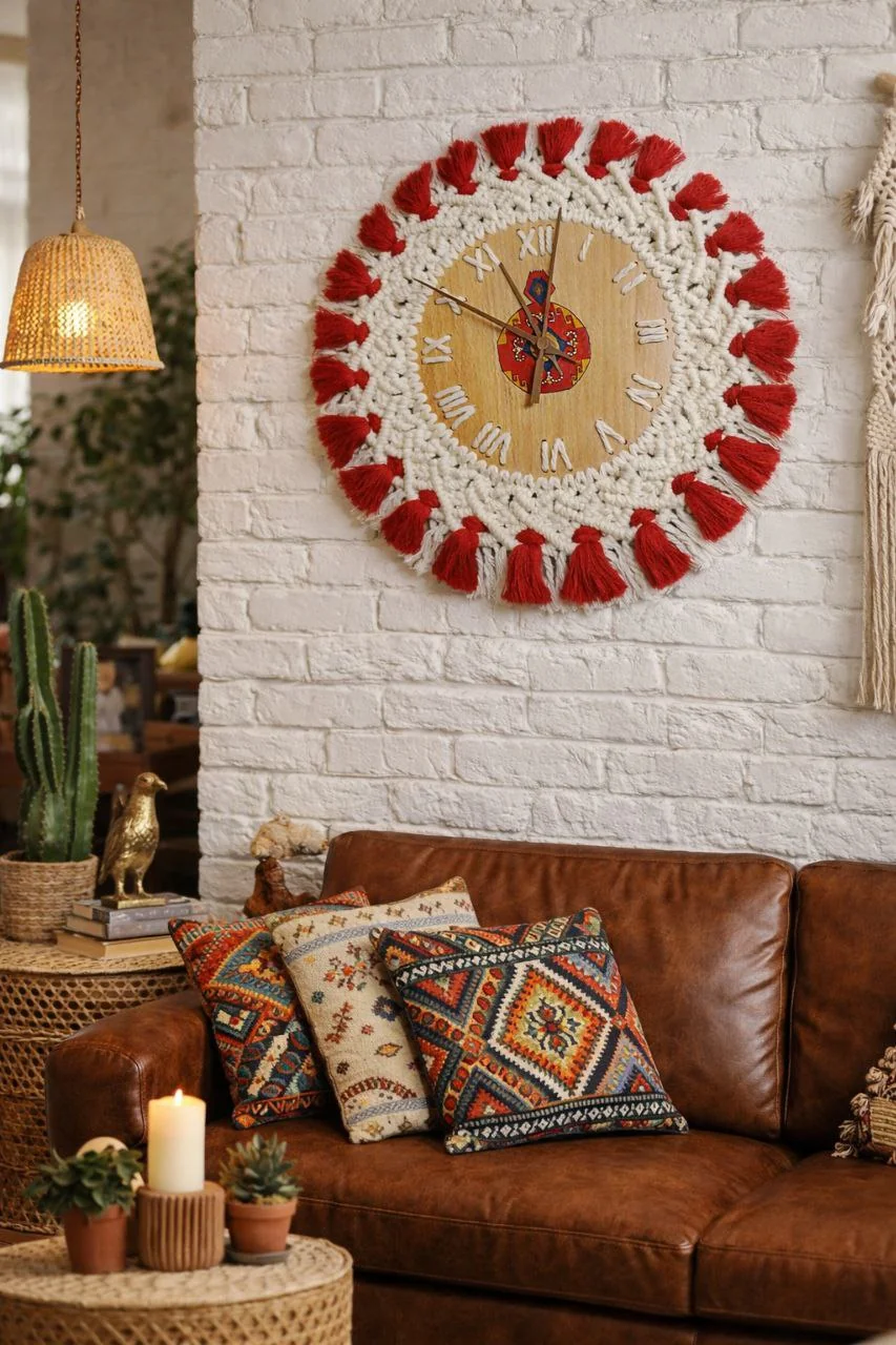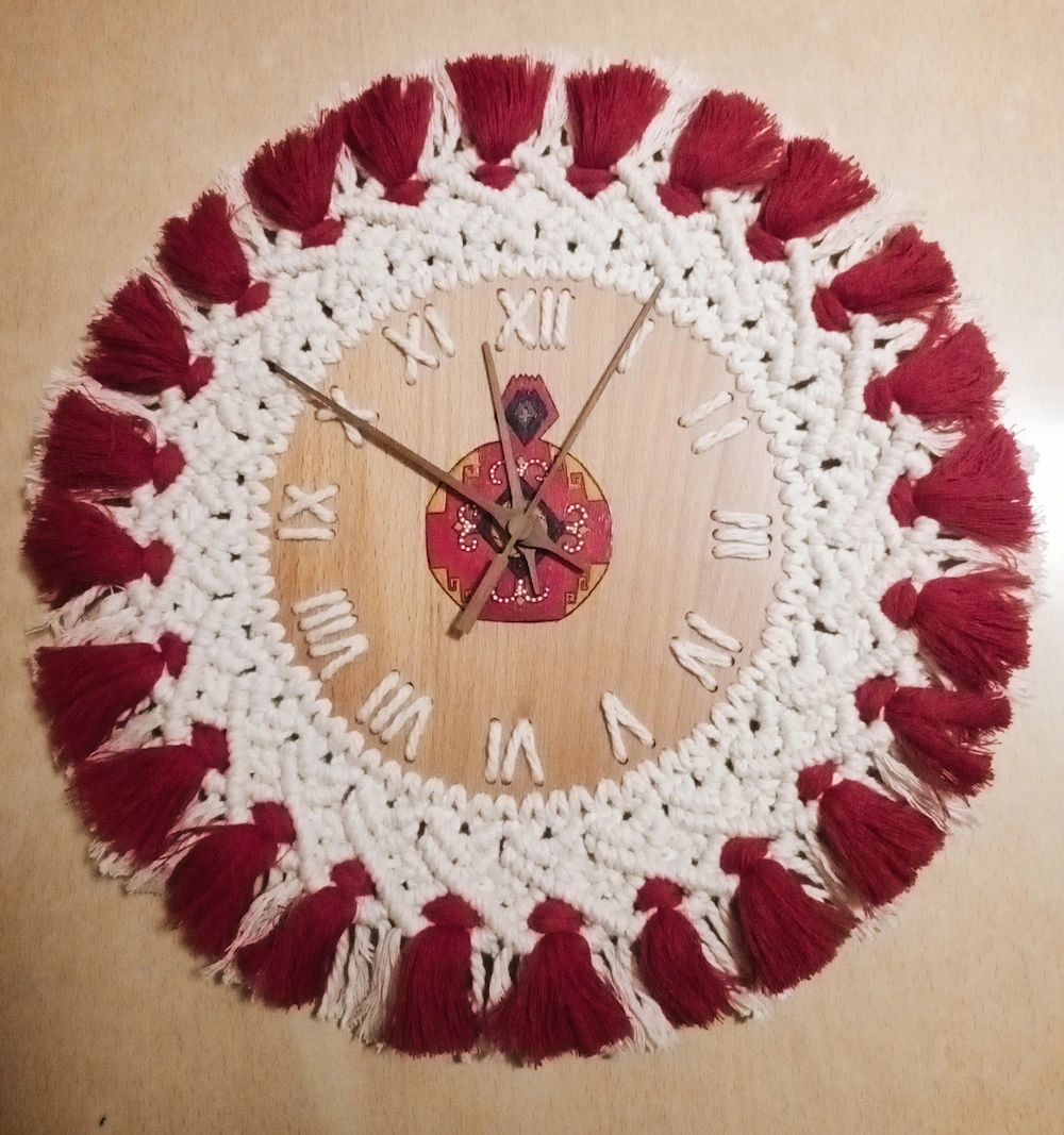 Handmade macramé wall clock featuring a hand-painted Armenian national ornament at the center. Crafted using eco-friendly materials, including 100% cotton thread, oak wood, and acrylic paints. Equipped with a silent clock mechanism. This piece is a perfect addition to your home interior or a unique gift for loved ones and friends.