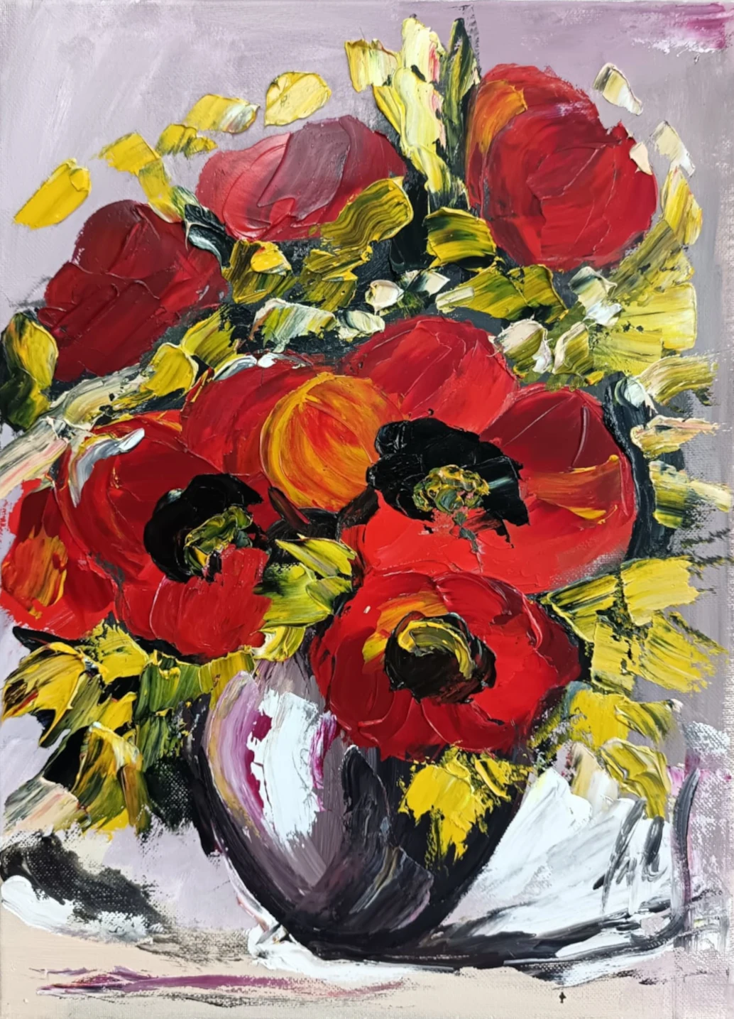 This still life presents the delicate beauty of wild poppies, arranged in a traditional clay vase. The harmony of soft colors and the natural setting convey freshness, warmth, and a vibrant, life-filled energy. The work is distinguished by its expressive brushstrokes and its ability to convey natural beauty through a unique artistic style.