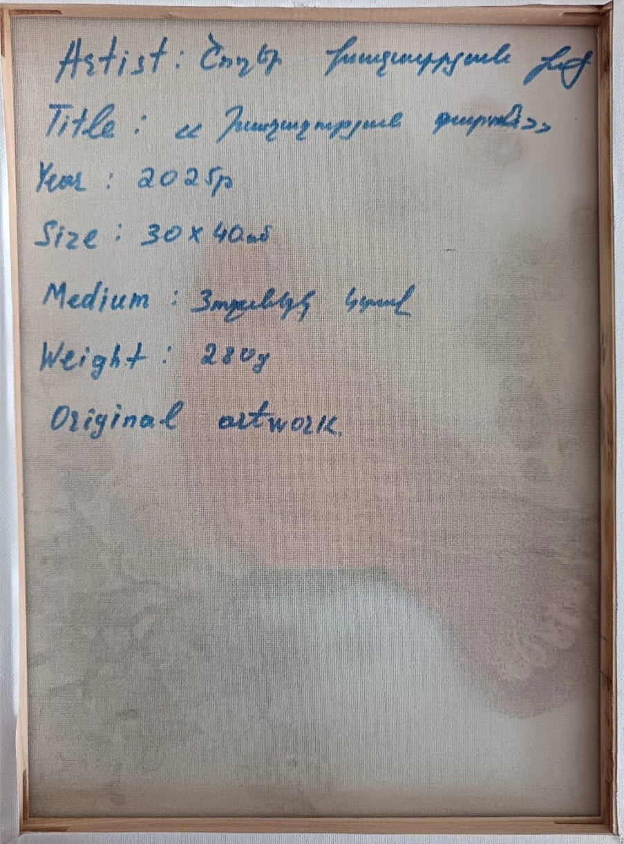 This work depicts a dove perched on a blossoming apricot branch against a fiery red background. The composition stands out with its rich colors and expressive brushstrokes, conveying the strength of life, natural beauty, and delicacy. The painting brings together the grandeur of Armenian nature and the symbolic charm of peace.